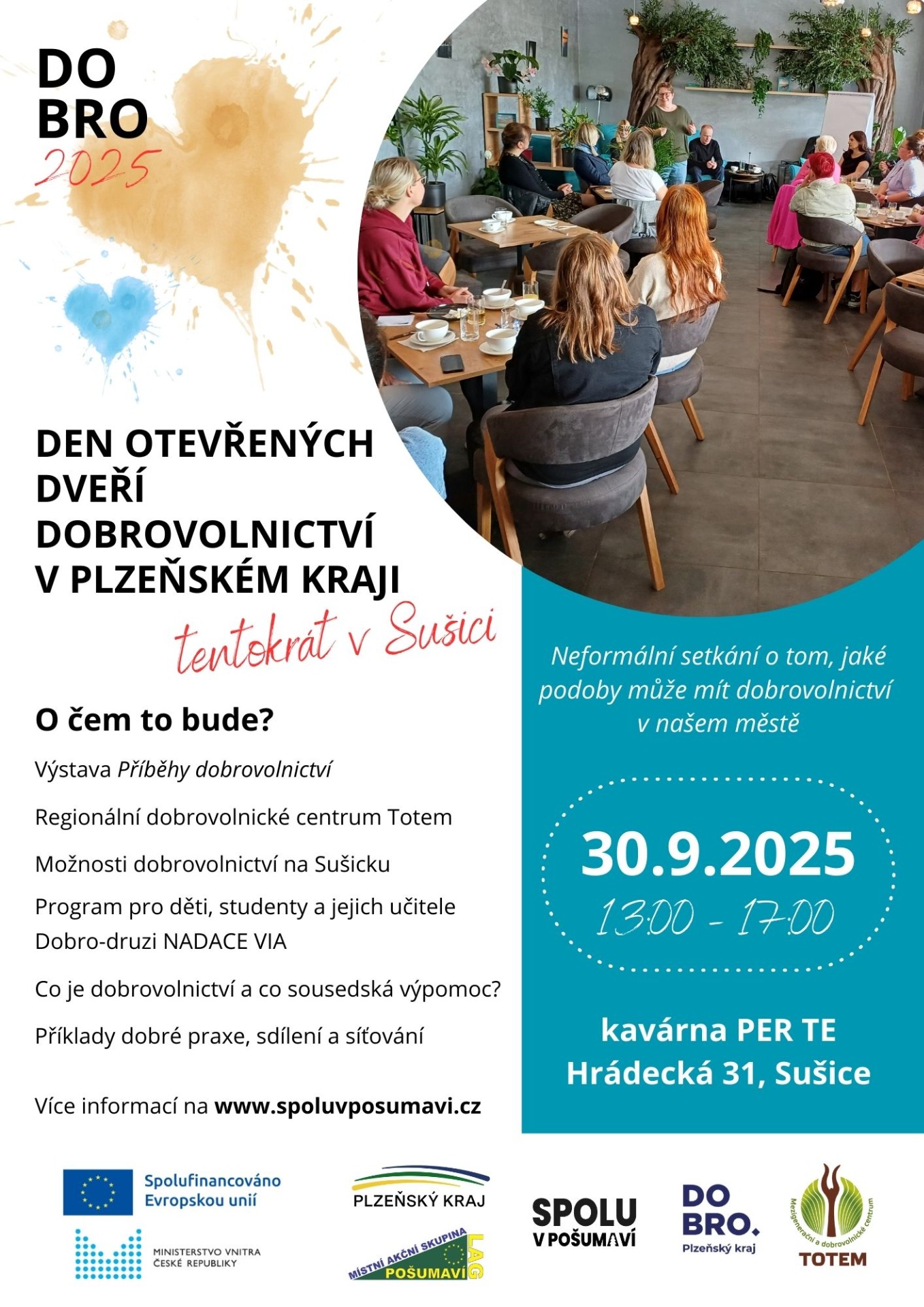 V úterý 30. 9. 2025 jsme se připojili ke krásné akci Den otevřených dveří dobrovolnictví v Plzeňském kraji v Sušici. Před hlavním programem proběhla spolu se studenty 1. ročníku sociální činnost SOŠ a SOU Sušice instalace výstavy Příběhy dobrovolnictví, kterou zapůjčilo Mezigenerační a dobrovolnické centrum Totem, a také diskuze o tom, co si studenti představují pod pojmem "DOBROVOLNICTVÍ" , jaké mohou být jeho podoby. V hlavním programu ředitelka Totemu Vlasta Faiferlíková mluvila o tom, jaká je jejich činnost a aktivity a zmínila také akci Dny dobrovolnictví, které se tradičně konají v dubnu. Ve workshopové části jsme představili naši organizaci a hovořili o tom, jak by mohlo vypadat dobrovolnictví u nás. Rádi bychom zapojili dobrovolníky do doučování dětí nebo do pomoci při rozdělování, přípravách a třídění věcí od dárců, jako je oblečení, boty a potřeby do domácnosti. Závěrem byl uveden zamýšlený projekt v rámci projektu Dobro druzi, který chystají studenti místního gymnázia, společně se svou vyučující, pracovníky muzea a dalšími aktéry.